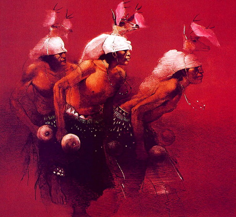 Vielleicht ist ein Gemälde, das einen Mann mit Federn auf dem Kopf und einen anderen Mann mit einer Katze auf der Schulter und einen weiteren Mann zeigt.
