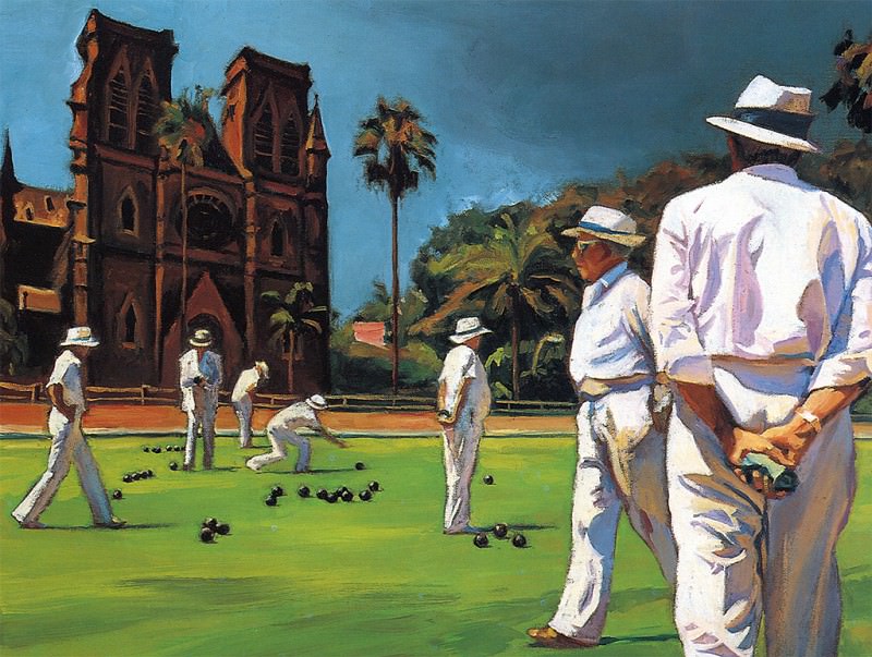 Vielleicht ist ein Gemälde einer Straße neben einem Gewässer mit Gebäuden auf beiden Seiten der Straße.
