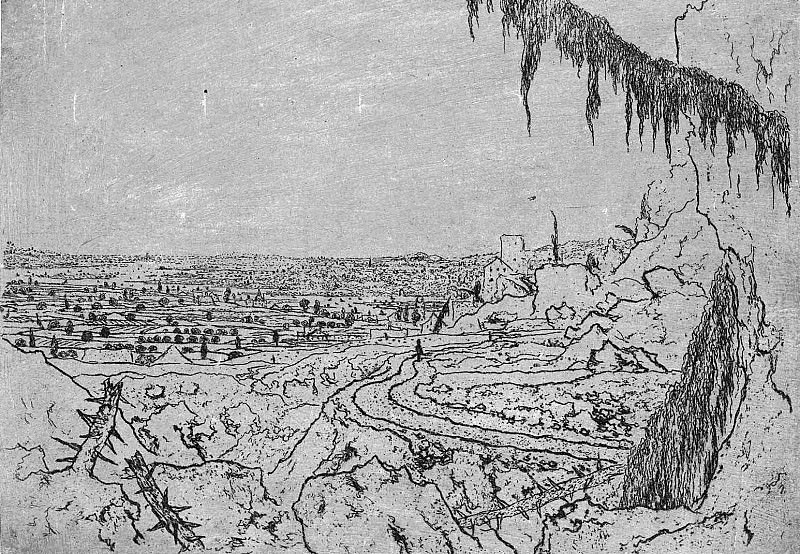 Vielleicht ist ein Gemälde einer Gebirgslandschaft mit einem Fluss im Vordergrund und einer entfernten Bergkette in der Ferne, mit einigen im Vordergrund stehenden Personen.