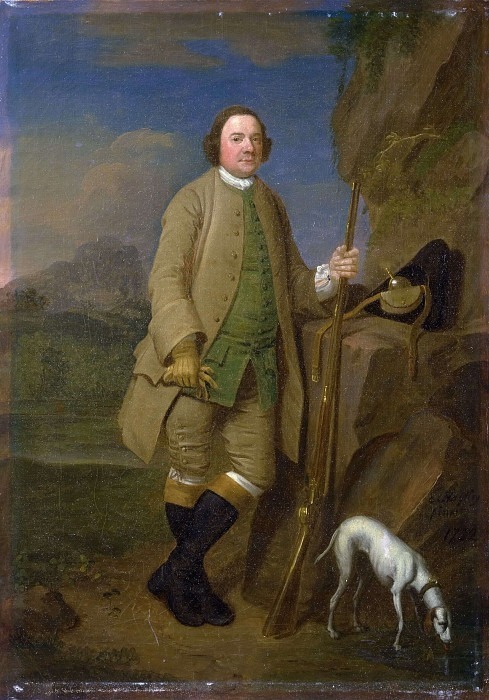 Vielleicht ist ein Gemälde eines Mannes in einem violetten Mantel und weißen Socken, der einen schwarzen Gegenstand in der rechten Hand hält und einen schwarzen.
