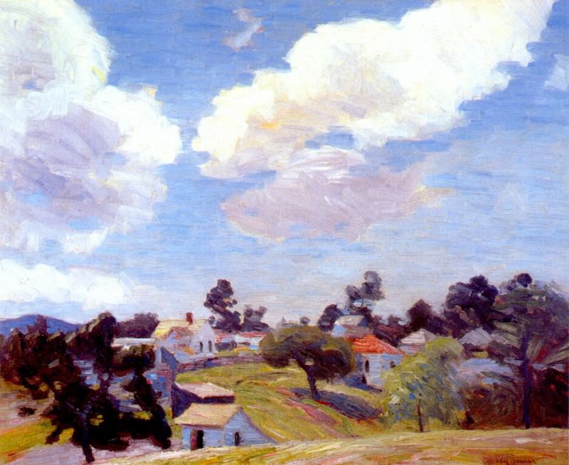 Vielleicht ist ein Gemälde mit einer Stadtansicht mit einem Gewässer in der Ferne und Häusern im Vordergrund.