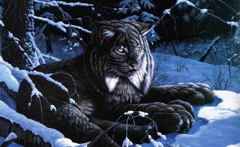Vielleicht ist ein Gemälde von zwei grau-weißen Wölfen, die sich vor einem schwarzen Hintergrund gegenüberstehen, wobei sich ihre Köpfe an den Stirnen berühren.